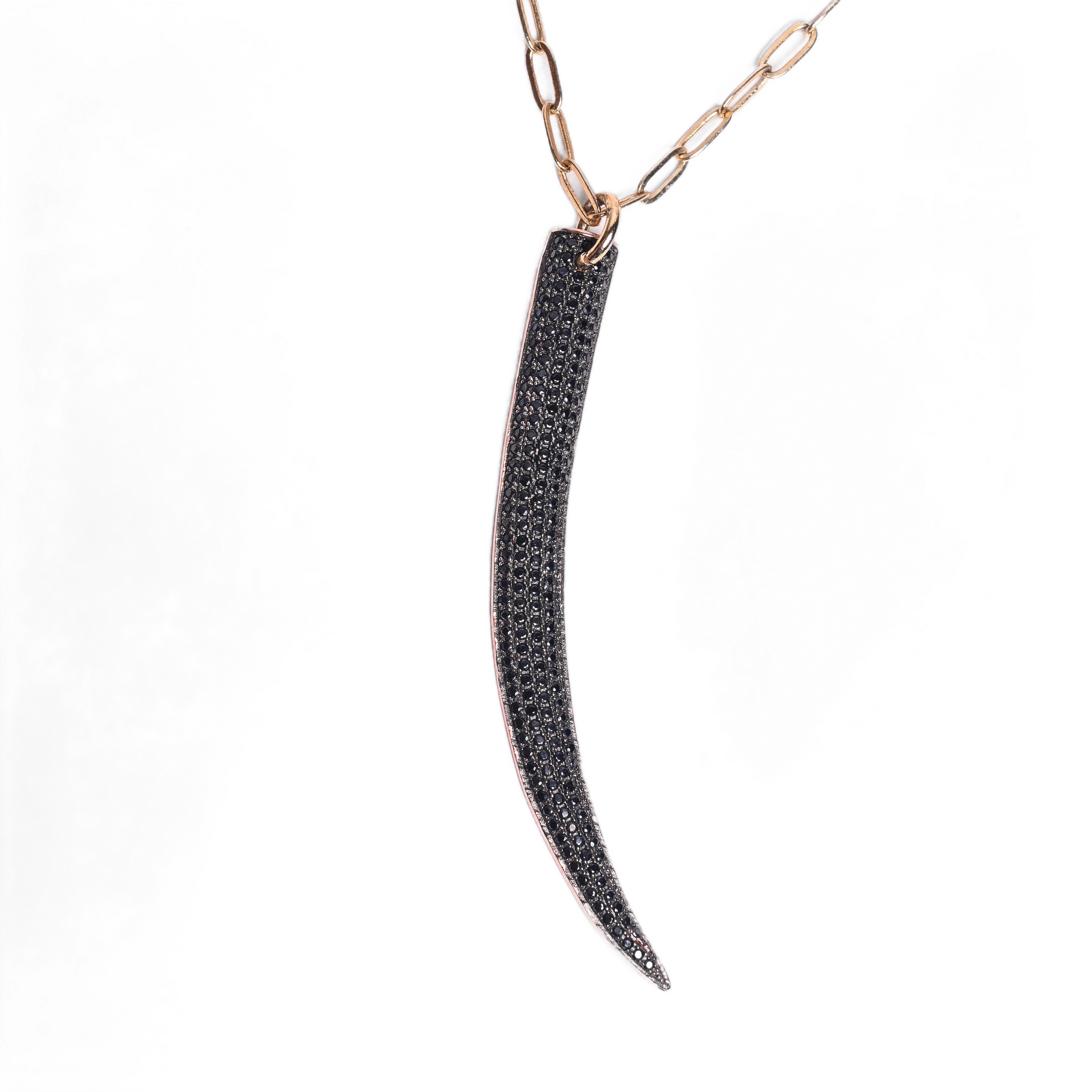 La Cadena Colmillo se distingue por su dije curvo alargado, que aporta carácter y una silueta poderosa, combinado con una cadena rodinada con circones que equilibra el diseño con un acabado elegante.